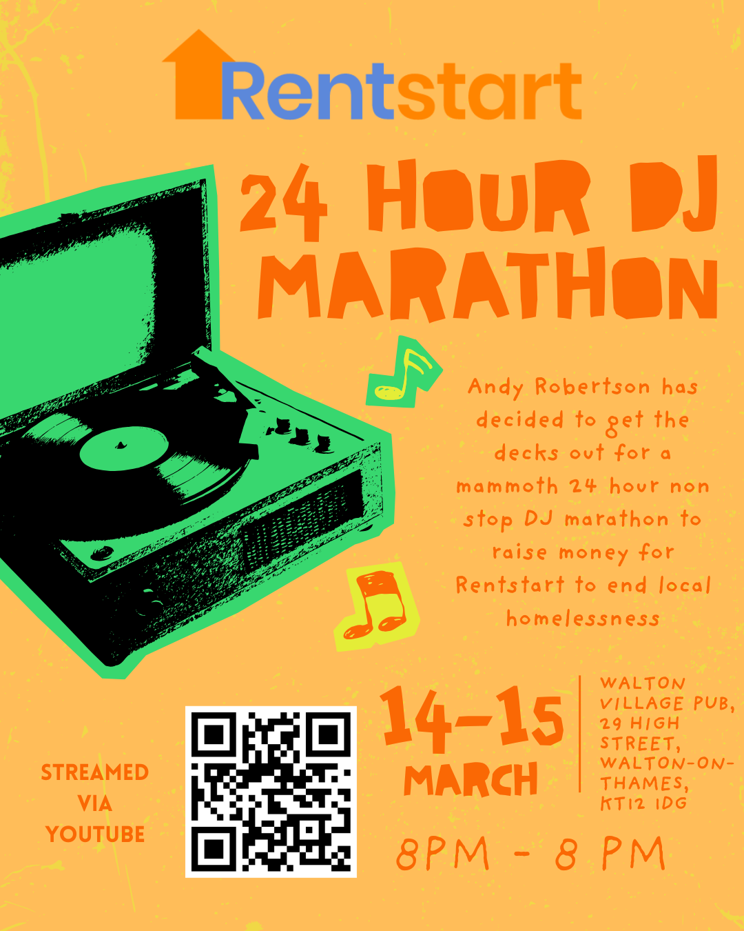 For the second year running, Andy will be pulling a 24 hour DJ shift at the Walton Village Pub to raise money for Rentstart. From 8pm on Saturday 14th March until 8pm on Sunday 15th March, expect a wild and funky range of tunes, guest DJ’s and a brilliant opportunity to support Rentstart!