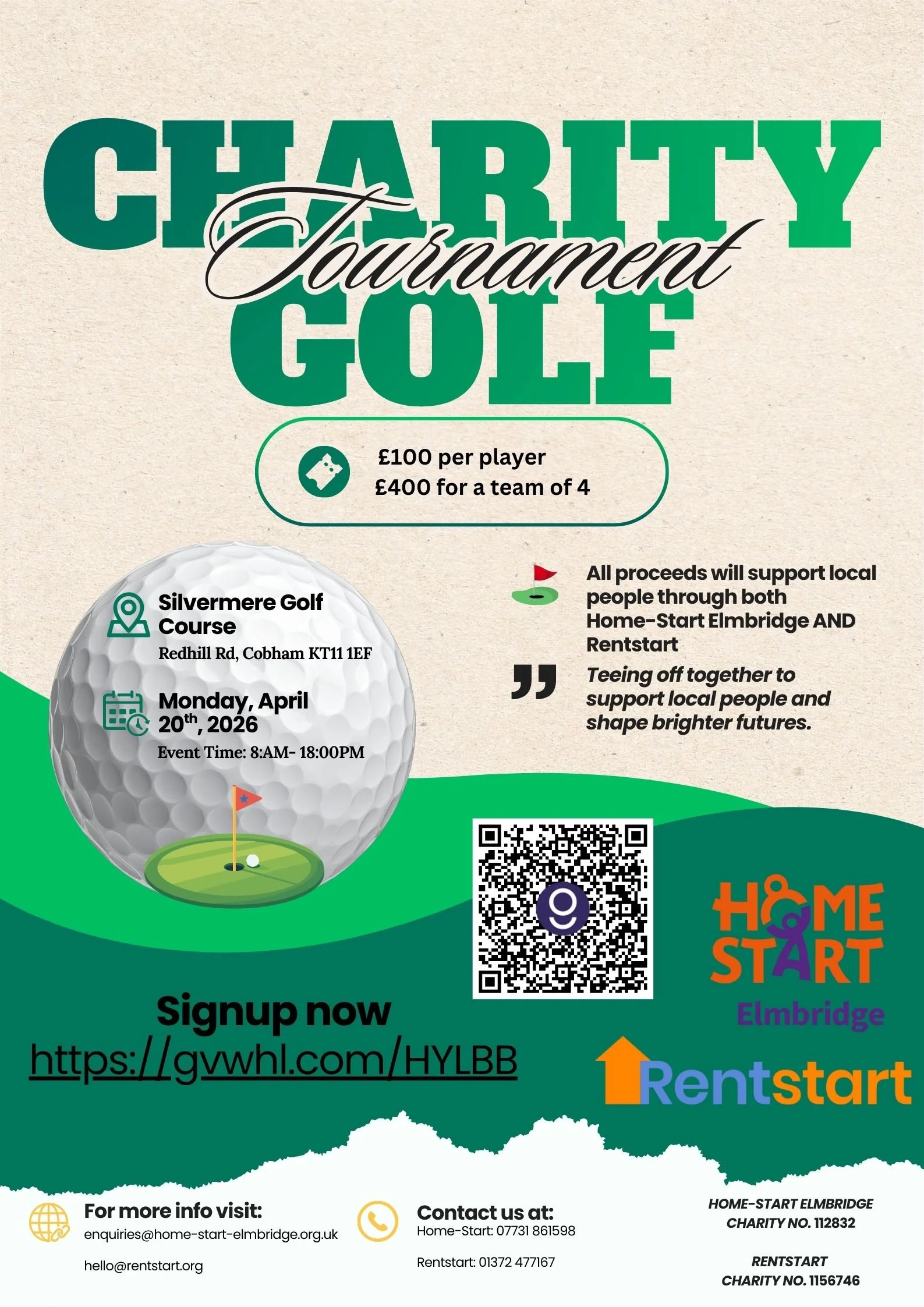 We are working with our good friends at Home-Start Elmbridge to host a Golf Day on April 20th at Silvermere Golf Course. Can you get a team of 4 together? 18 holes of golf, breakfast rolls and a two course dinner included. Secure your places now!